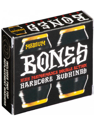 The HardCore insert in the center of BONES bushings connects the two sides of each bushing together by bonding them to the HardCore insert. When the hanger web squeezes one side of a HardCore bushing, that side of the bushing reacts just like a normal bushing, but the chemical bond between the HardCore and the cushion keep the bushing from being squeezed out the other side. It actually increases the resistance to turning because it is held in place by the HardCore insert. This means basically that BOTH sides of the BONES HardCore Bushing are resisting your turning force. That’s why we call BONES Bushings the first double action truck bushings.
