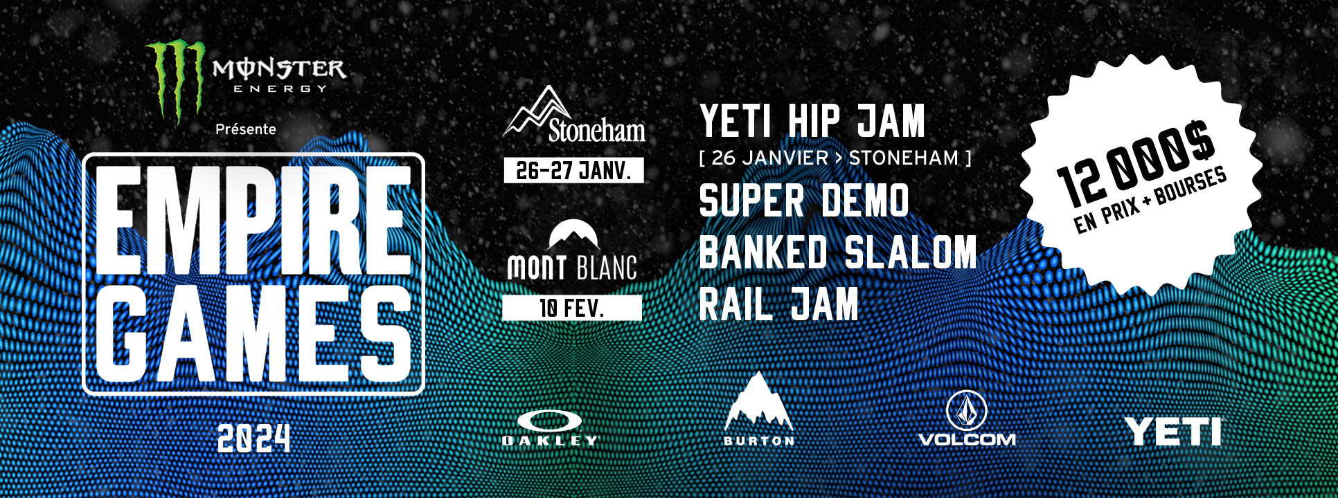 Faites partie de cet événement unique présenté par Empire et Monster Energy en collaboration avec Burton, Oakley, Volcom et YETI. Ouvert à tous les rider qui désirent participer dans les différentes catégories, et ce, peu importe votre niveau!