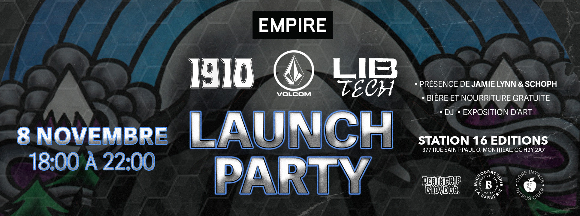 Le vendredi 8 novembre, de 18 h à 22h, nous vous invitons à venir fêter à la Station 16 Editions pour le lancement officiel du snowboard Libtech et du Manteau Volcom | EMPIRE Collaboration 25e Anniversaire.