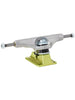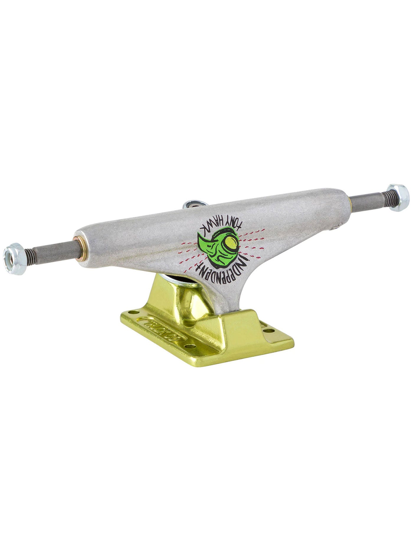 Independent Forged Hollow Tony Hawk Transmission trucks featuring artwork by Mark Mothersbaugh @markmothersbaugh. Polished silver hanger with pad printed Hawk logo art graphic on front and laser etched signature on back, anodized neon green baseplate, black cushions, and silver hardware.