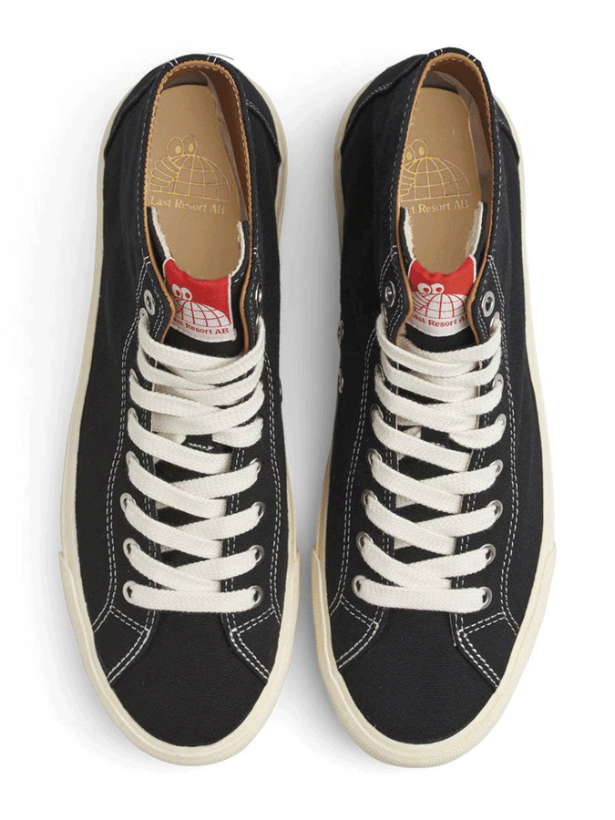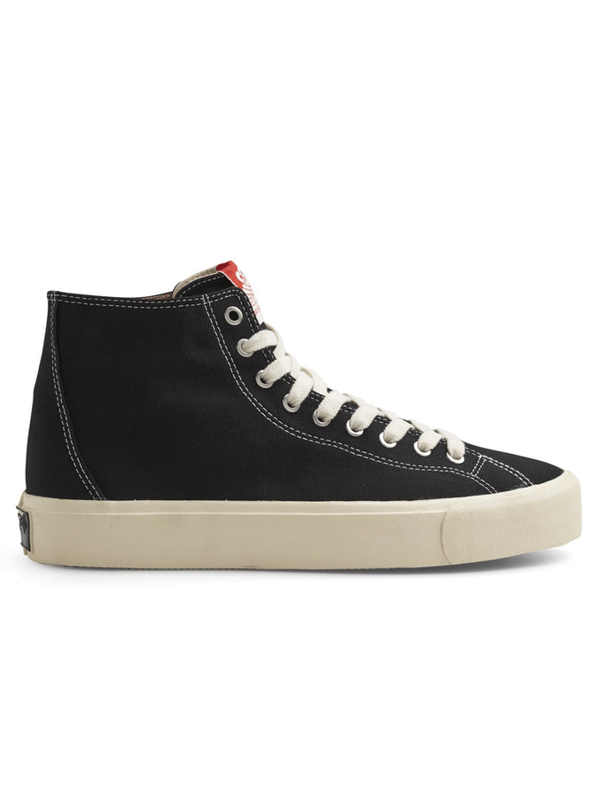 VM003-Hi Canvas Black/White is a casual un-padded silhouette, and it also has the hidden rubber reinforcements between the upper and lining. 100% Vegan friendly.