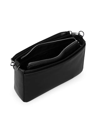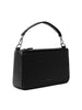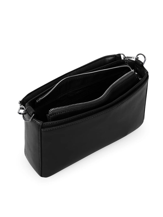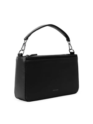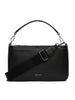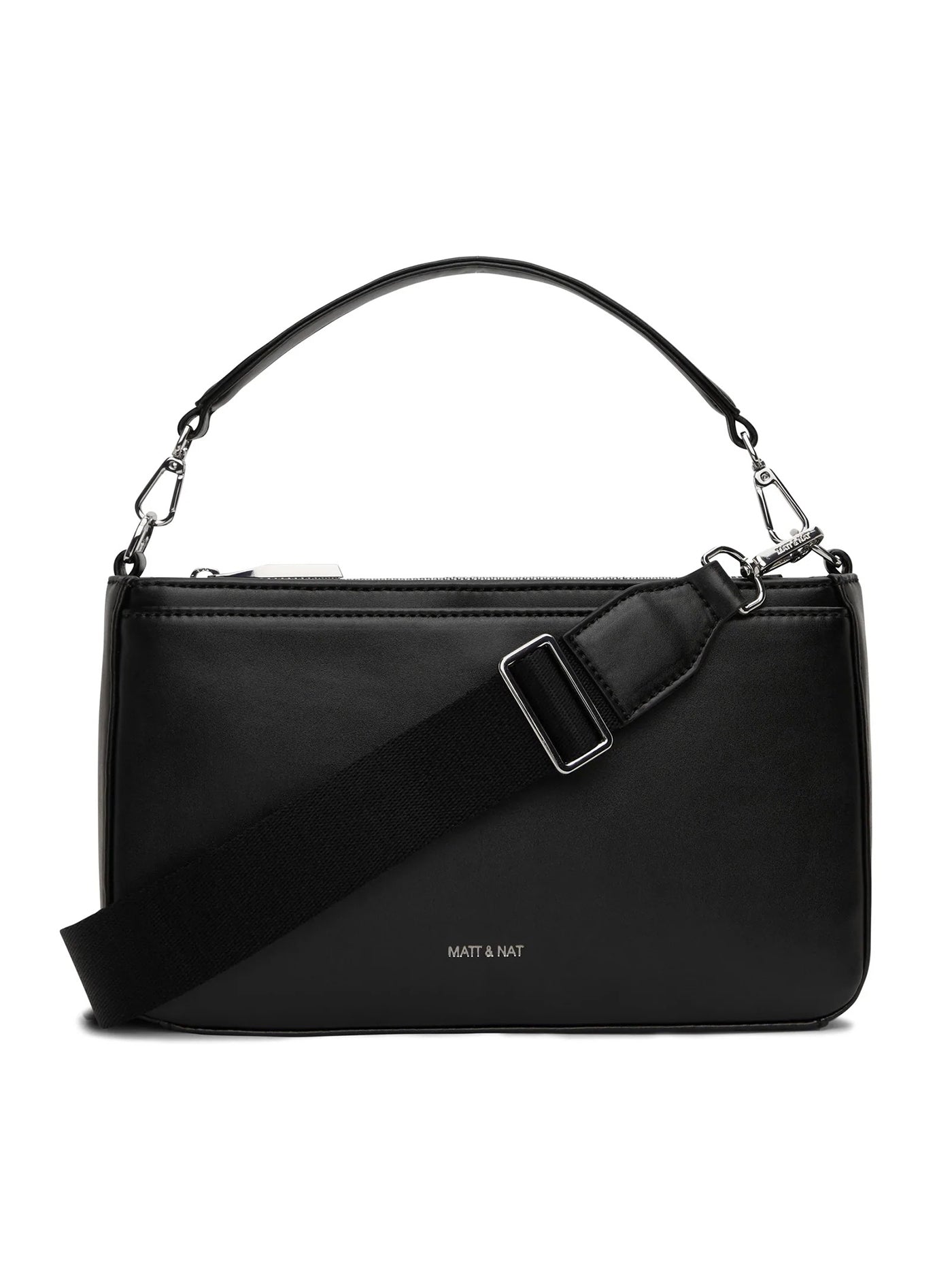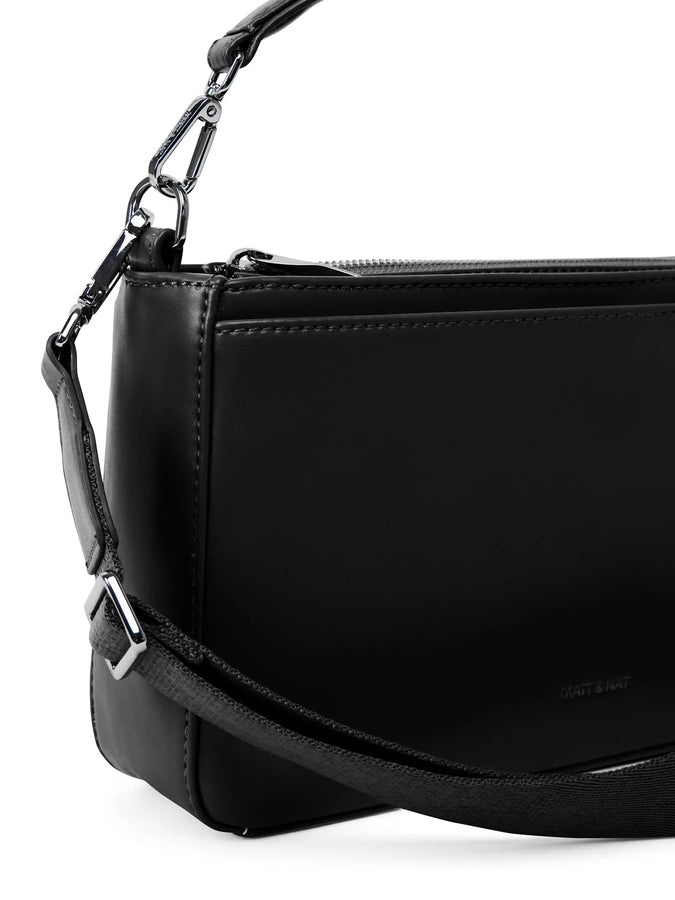 Convertible crossbody/shoulder bag with a detachable and adjustable webbing strap, a detachable top handle to hand-carry, zip closure at the main compartment, and front and back slip pockets with snap closure.