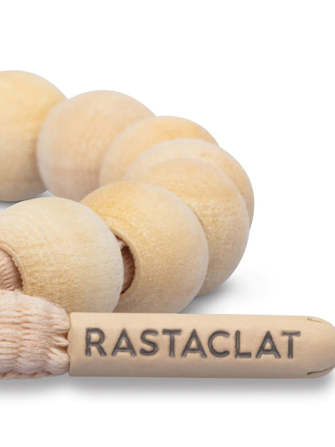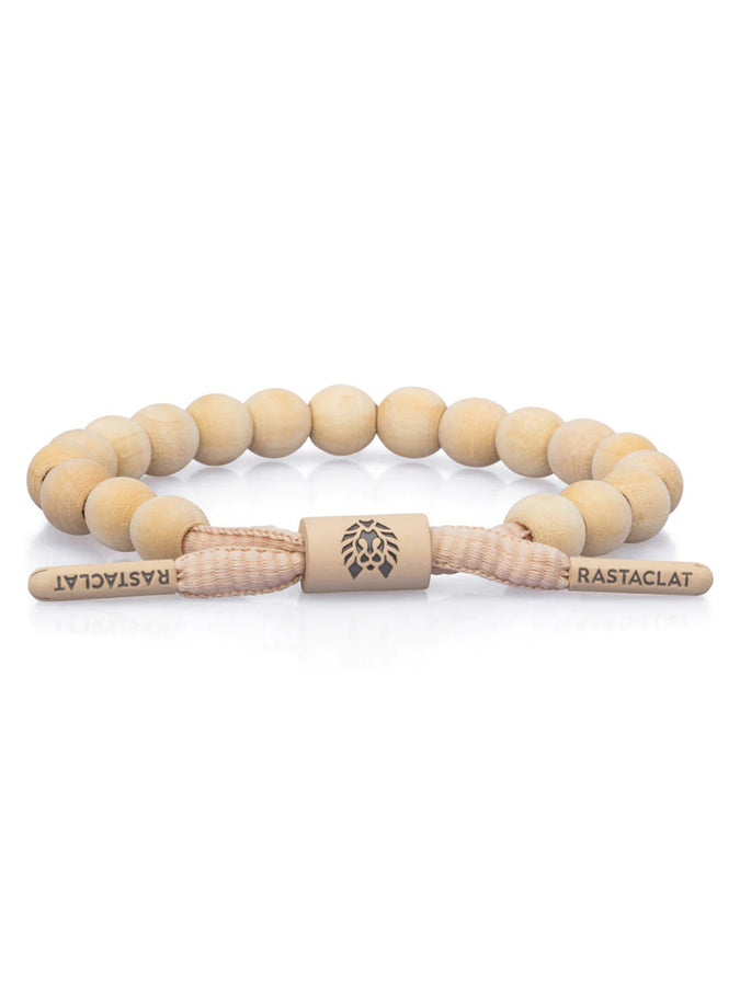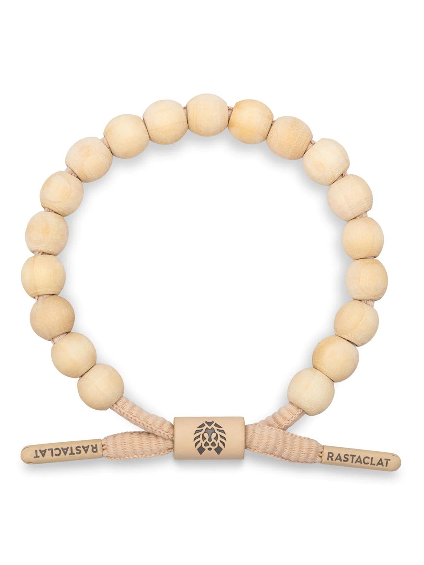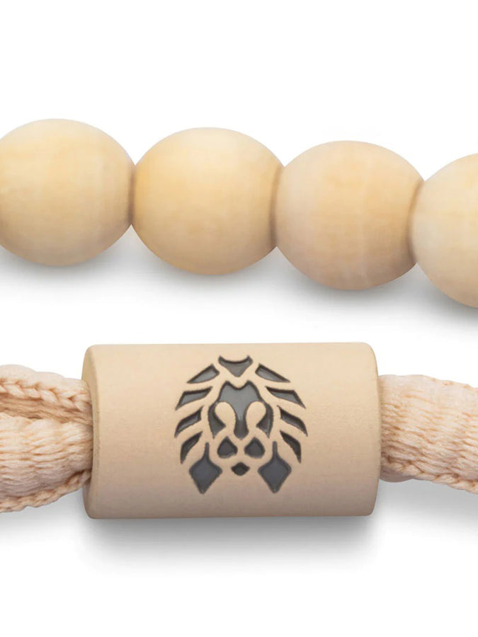 THE MANIFEST BRACELET IS A WOODEN BEADED BRACELET FEATURING A TAN HUE AND MATTE ENAMEL HARDWARE WITH DEBOSSED EMBLEMS.